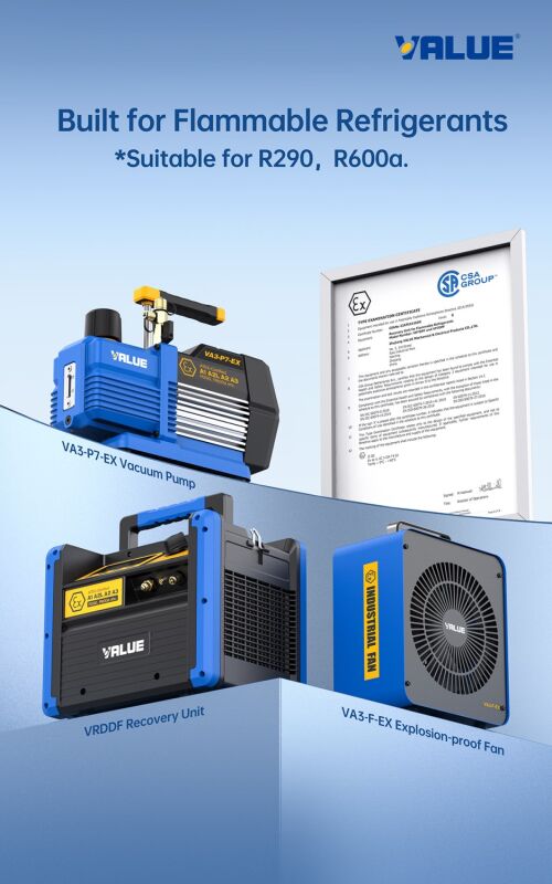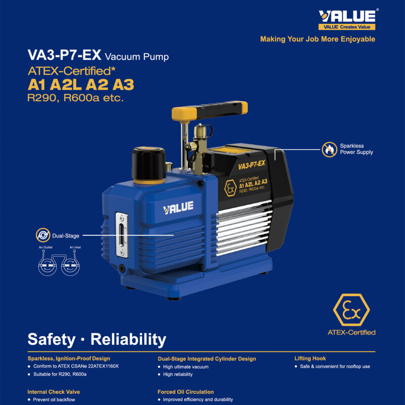 The VALUE VA3-P7-EX is an ATEX-certified, dual-stage vacuum pump specifically designed for flammable refrigerants like R290 and R600a, featuring a sparkless design with certification number CSANe 22ATEX1160X, ensuring safe operation in explosive atmospheres (Zone 2/3 environments) by meeting the ATEX Directive 2014/34/EU with categories like II 3G Ex ec ic nC h IIB T4 Gc, making it ideal for HVAC/R technicians working with new-generation, low-GWP refrigerants